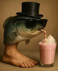 カルーは足があり、ストロベリーミルクシェイクを飲む魚です。帽子とメガネをかけています。帽子とメガネの色は黒です。