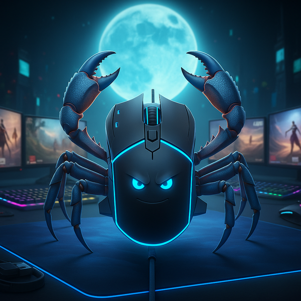 ゲーミングマウスのようなデザインのコンピューターマウスで、青色LEDからカニの付属肢が伸びています。邪悪な笑みを浮かべ、青く光る目が特徴です。