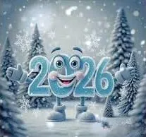 2026 2026 2026 Sahurとも言われる。冬用の手袋とブーツを履いた数字2026のような姿をしたインドネシアのブレインロットです。雪に覆われた木々と雪景色を背景に、スノードームの中にいます。