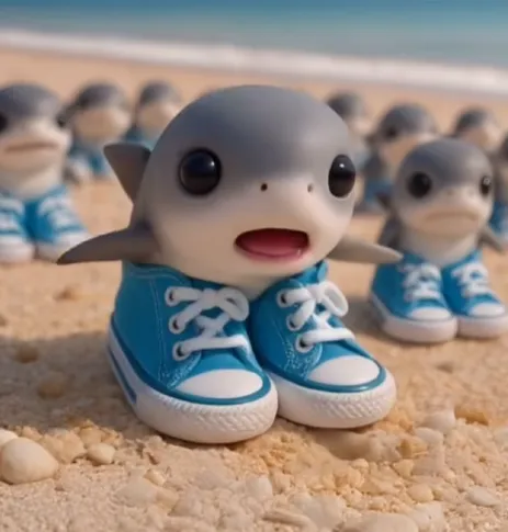 イタリアンブレインロットの人気キャラクター、ロス・トララレリトス!父親のトララレロ・トラララと同じ青い靴を履いた、とても小さなサメです。背景はビーチです。そのユニークな見た目と不思議な魅力で、多くのファンを惹きつけています。