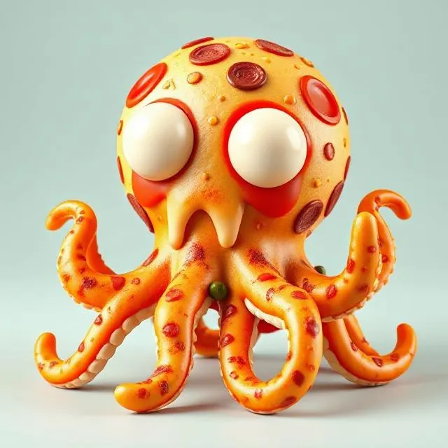 オクトピッツィーニ ・マルゲリーティーニは、イタリアのミーム現象「ブレインロット」から生まれた、風変わりなキャラクターです。ピザでできた遊び心のあるタコとして描かれ、目は溶けた大きなモッツァレラチーズのボール、触手からはトマトソースが優しく滴り落ちています。ペパロニ、オリーブ、ピーマンなど、色とりどりのピザのトッピングが体を覆い、陽気で滑稽な印象を与えています。