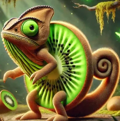 キウイの皮のカメレオンです。手足と尻尾はキウイの皮のような毛深く、柔らかい質感です。