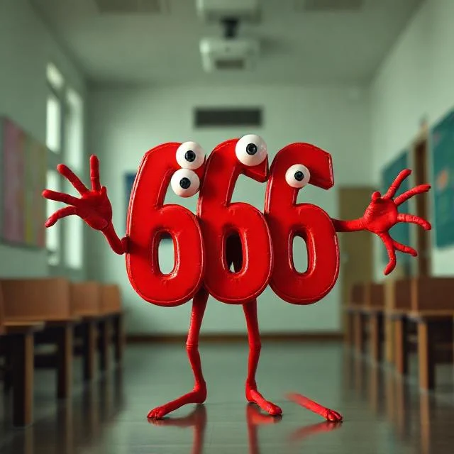 学校の廊下にいる4つの目を持つ赤い色の擬人化された666のキャラクターとして描かれています。