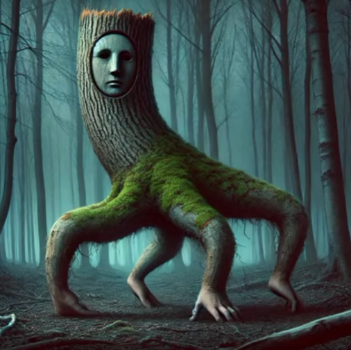 人間の顔があり、手足に苔が生えた木。